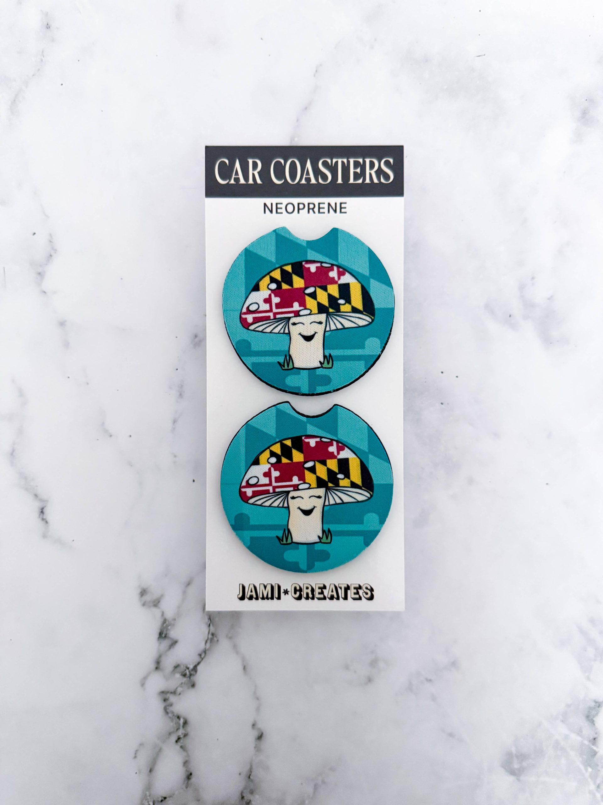 Item: Teal Maryland Mushroom Car Coasters Item Description: These are the perfect way to add some flair to your car. Keep your cup holders clean with these coasters. Please note due to the texture /material of the coasters there will be some slight variation in the colors. Designs are sublimated onto the coasters making them permanent. This is for a set of 2 car coasters. Size/ Shape / Material: Round Neoprene: 2.6″ diameter, 1/4″ thick. Neoprene type fabric. Back / edge = black All designs are hand drawn on an iPad. Handmade for You in Crownsville, MD ** NOTE TO BUYER : Monitors differ meaning the colors seen on screen may vary or appear slightly different in-person. **