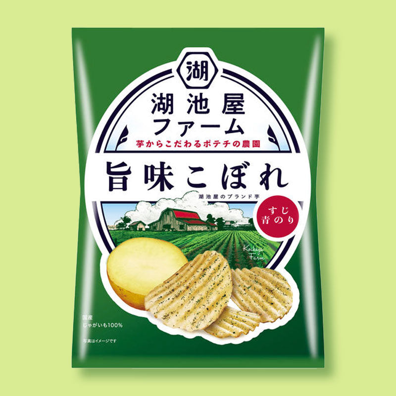 Take this pack of potato chips to the picnic! These ridged potato chips are seasoned with bits of green laver. Share them with your friends!