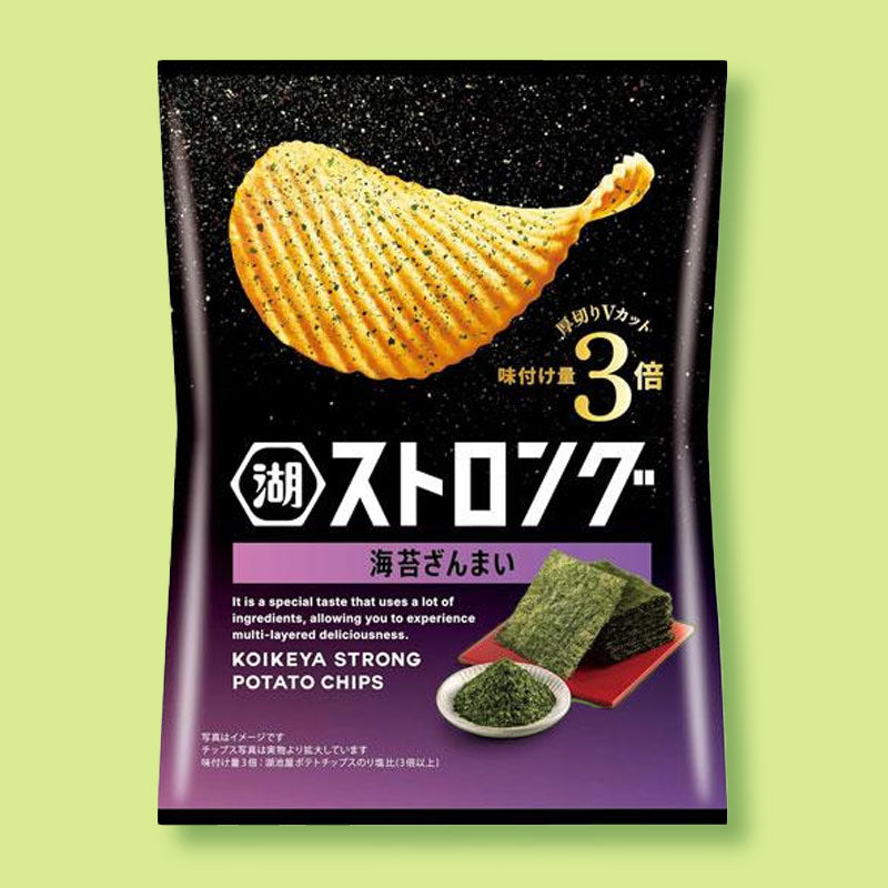 Try this bag of jagged potato chips for a seaweed-rich snack experience! These chips contain the highest amount of seaweed in the Koikeya lineup, balanced with the savory taste of sesame oil and a hint of chili pepper.