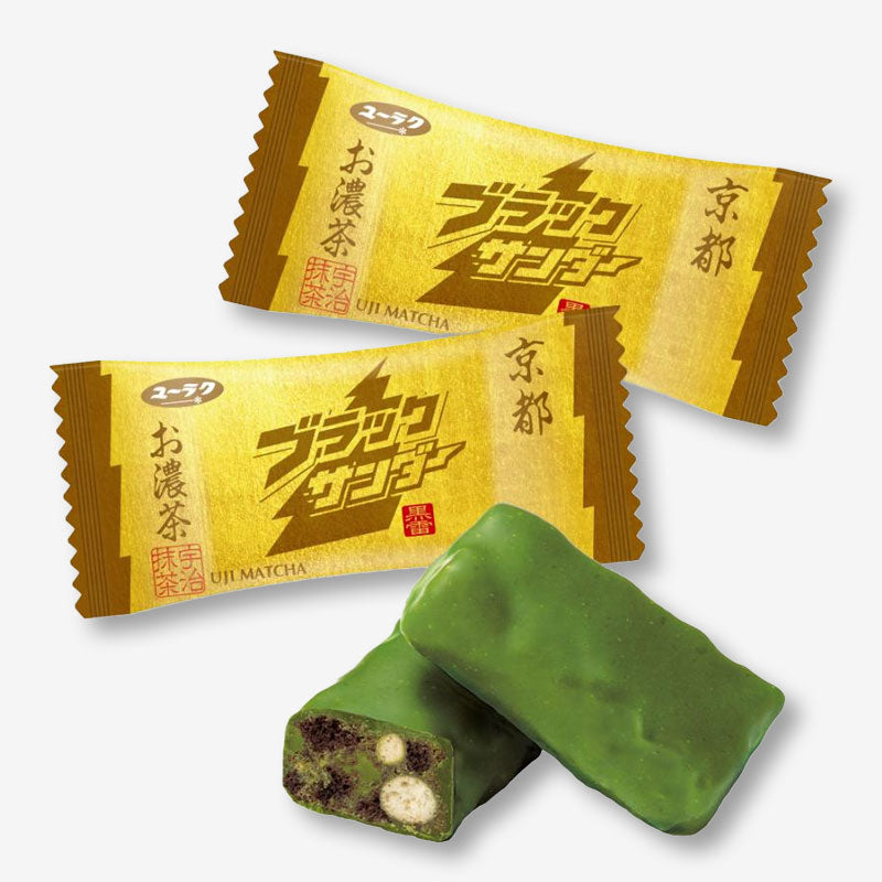 The popular Black Thunder chocolate snack gets a Kyoto twist with this Koicha or thick tea flavor! The Uji matcha dough is filled with crunchy cocoa cookies and rice puffs for a perfect balance of earthy and sweet tastes.
