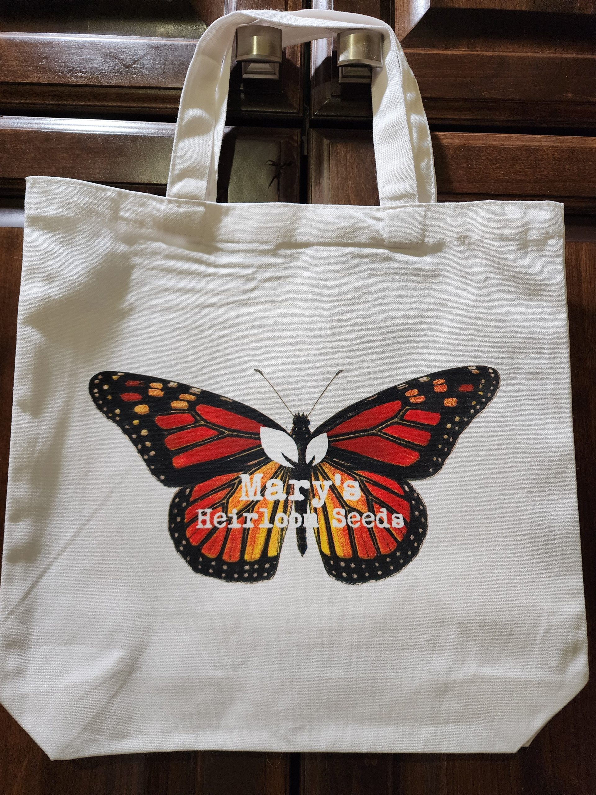 Mary’s Heirloom Seeds “Butterfly” printed white Cotton Tote Bag/ book bag.